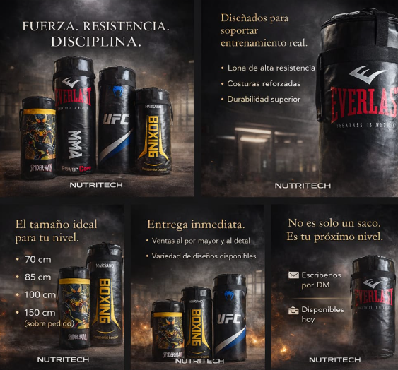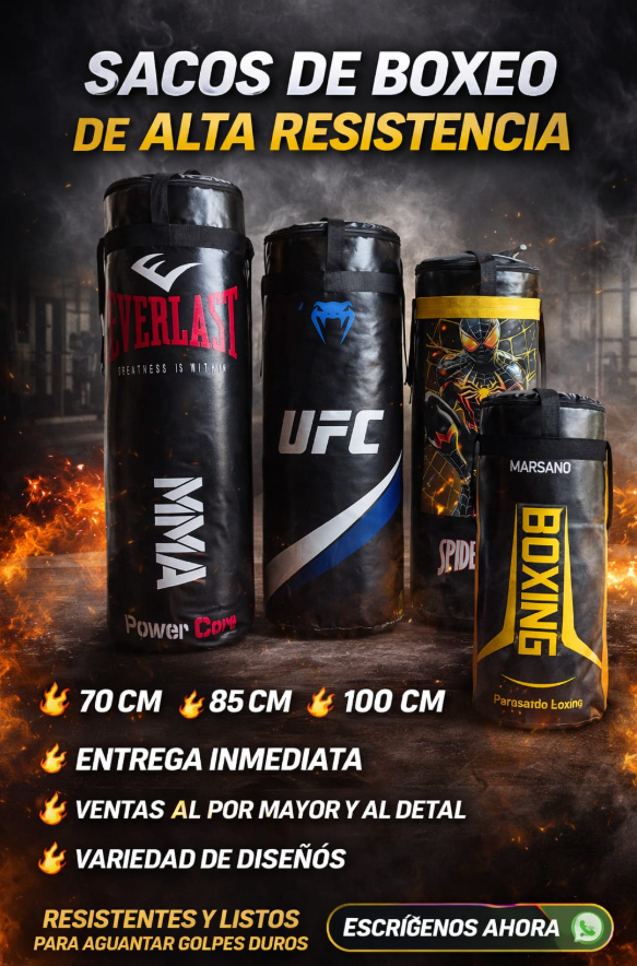 Perfecciona tu técnica, mejora tu potencia y descarga toda tu energía con nuestros sacos de boxeo profesionales, fabricados para soportar entrenamientos intensivos de boxeo, MMA, kickboxing y fitness funcional. Disponibles en múltiples tamaños para adaptarse a tus necesidades y espacio de entrenamiento.
